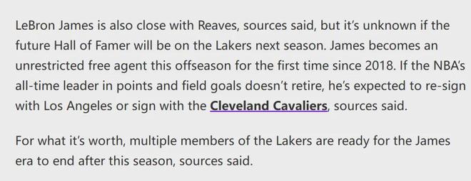 Ashish Mathur在報(bào)道中透露,多位湖人球員和管理層已經(jīng)做好準(zhǔn)備,在今年夏天迎接詹姆斯時(shí)代的終結(jié)。昨天教主剛剛寫(xiě)過(guò),今年夏天,里夫斯跳出合同成為自由球員,詹姆斯的合同屆時(shí)也將到期,湖人管理層很難同時(shí)留下他倆。