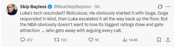 ‘金牌詹黑’斯利普-貝勒斯對東契奇被取消技犯很不滿,他表示:盧卡的技術犯規(guī)被取消了?太荒謬了,明顯是東契奇先挑釁比塔澤的,比塔澤只是以牙還牙而已,之后東契奇還一路升級沖突。NBA為了票房、收視率對每個吹罰都有自己的解釋方法。