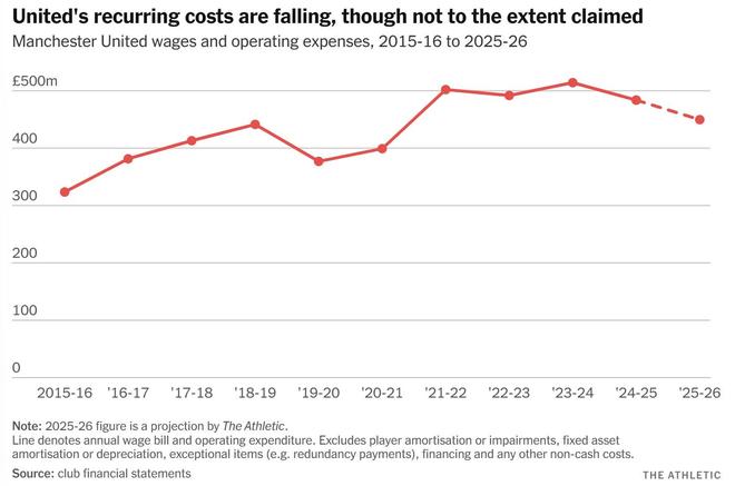 即使我們忽略裁員計劃的成本、解雇滕哈格和阿莫林(以及丹-阿什沃思)兩位總監(jiān)的巨大開支,以及在拉特克利夫治下持續(xù)上升的轉(zhuǎn)會費攤銷成本,曼聯(lián)的實際節(jié)省也遠(yuǎn)未達(dá)到1.25億英鎊。
